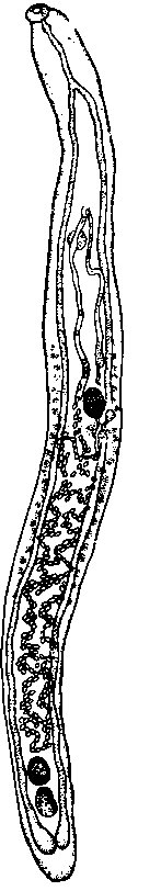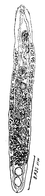 Яйца 0,029 мм длины, 0,0Ю мм ширины. Мелкие желточные фолликулы объединяются в небольшие группы. Они начинаются несколько позади брюшной присоски и доходят до уровня переднего края переднего семенника.