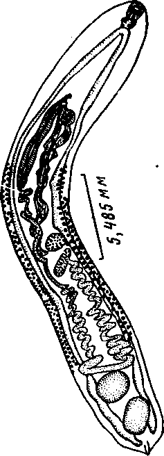 Брюшная присоска лежит в начале второй четверти длины тела, 0,14 мм в диаметре. Ротовая присоска лежит субтерминально, 0,12x0,14 мм. Префаринкс короткий, мускульный, фаринкс 0,11 мм длины. Пищевод у экземпляров средней величины достигает 0,21 мм длины. Кишечные стволы доходят до заднего конца тела. Семенники лежат один позади другого между концами кишечных стволов; их размеры 0,25x0,31 мм. Половая бурса, достигающая 0,1 хЗ,91 мм, тянется от яичника почти до брюшной присоски, где она впадает в большой половой синус.
