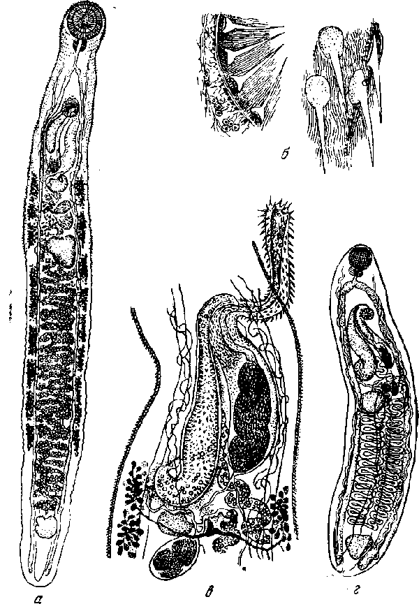 а —марита зрелая; б — мышечные пучки и наружные шипики; в — концевые части половых протоков; г — марита молодая