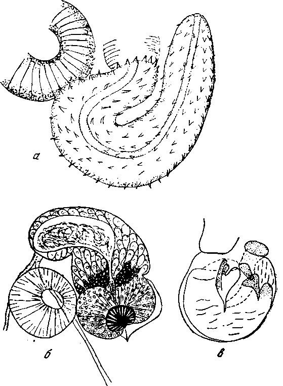 a—папилла Maritrema magnidrrus Belop., 1952 (ориг.); б — папилла Pseudelevinseniella cheni Tsai, 1955 (по Цай, 1955); в — «Genitale guide» Gynaecotyla adunca (Linton, 1905) (по Хантер, 1952)
