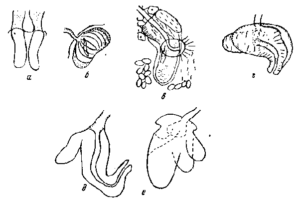 а— М. claviformis (Brandes, 1888); б—М. arenaria (Belop. et Uspenskaja, 1953); в — М. muellhaupti (Coil, 1956); г — M. papillorobustus (Rankin, 1940); д — M. pseudogonotylus (Chen, 1944); e— Af. trilobatus (Cable et Kuns, 1951)
