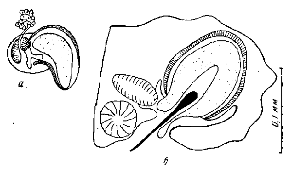 а — схема строения генитальной полости; б — поперечный разрез в области «органа раздражения»