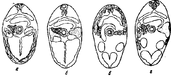 а — г — вариации расположения желточников и петель матки (по Этджес, 1953)