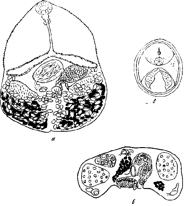 a — марита; 6 — поперечный разрез в области полового отверстия; в—циста с метацеркарией из Limulus polyphemus
