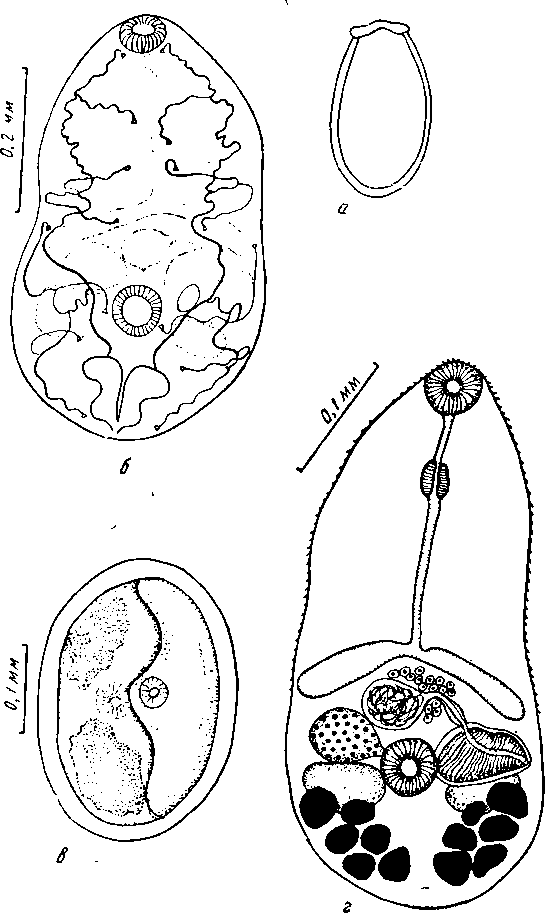 а - яйцо; б — экскреторная система (по Капрон, Деблок и Бигэ, 1957); в — циста с метацеркарией; г — метацеркария, извлеченная из цисты (по Белопольской, 1957)