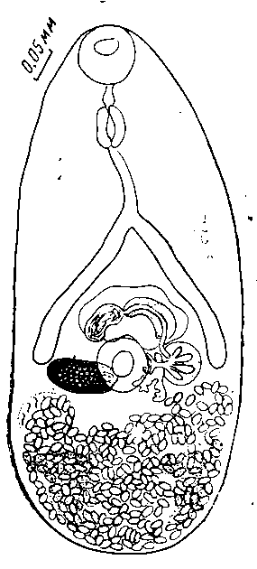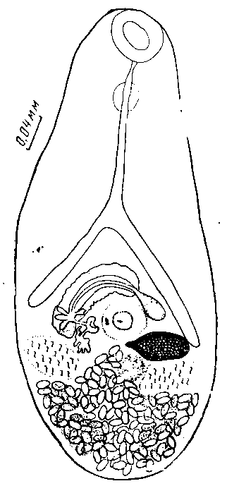 Семенной пузырек 0,089— 0,11 X 0,039 0,045 мм, лежит впереди брюшной присоски, почти медианно. Простатическая часть хорошо развита, 0,022—0,026x0,096 мм, окружена простатическими клетками. Семяизвергательный канал мускулистый, узкий, проникает в мужской карман через узкую папиллу диаметром 0,005—0,011 мм. Папилла входит в мужской карман медианнее мускулистых карманчиков, которые имеют тонкие стенки 0,002—0,0028 мм толщины и лишены орнаментации. Женский карман с глубокими дивертикулами, стенки его лишены мускулатуры. Овальный яичник расположен латерально и дорзальнее брюшной присоски. Желточные фолликулы закрыты яйцами, лежат латерально позади семенников. Яйца многочисленные, их размеры 0,019x0,009 мм.