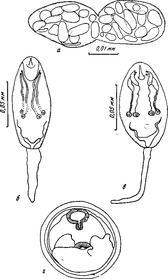 a — спороциста; б — молодая церкария; в — сформированная церкария (по Чубрик, 1957); г — инцистированная метацеркария (по Кулачковой, 1958)