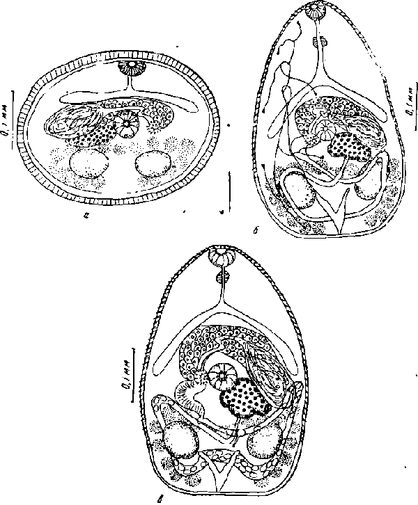 a — циста с метацеркарией; б — метацеркария, извлеченная из цисты; в — 5-дневная марита, выращенная in vitro