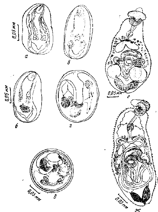 инцистированные матацеркарии в возрасте: а — 15 дней; б— 30 дней: в —: 40 дней; г — 45 дней; д — 55 дней; метацеркарий, извлеченные из цисты в возрасте; е — 55 дней; ж — 60 дней