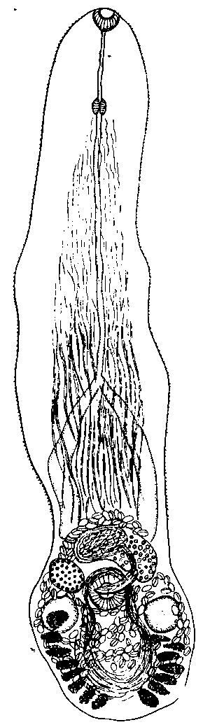 Кутикулярная пластинка служит желобком, по которому направляется сперма. Овальный яичник помещается справа и несколько впереди брюшной присоски.