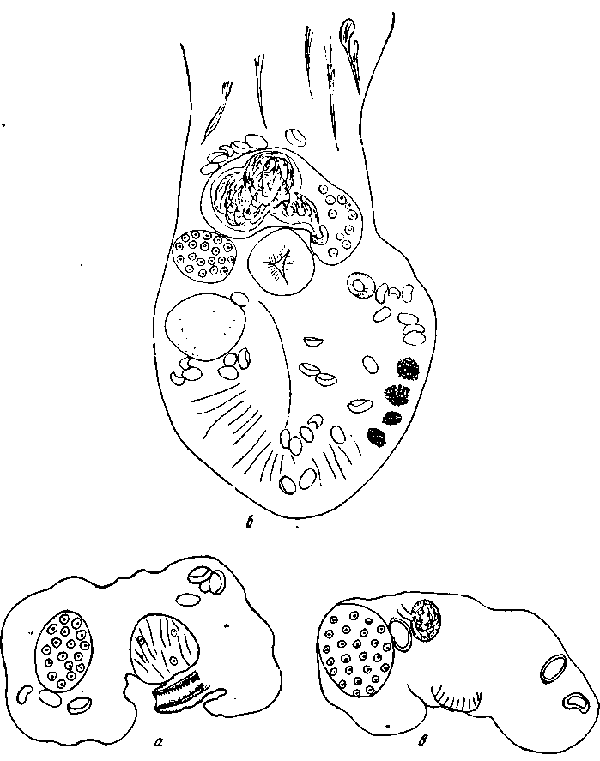 a — папилла с пластинкой выдается через половое отверстие (поперечный срез); б —участок фронтального среза; в — семяприемник (поперечный разрез) (ориг.)