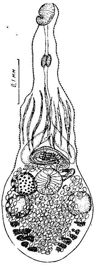 Матка занимает заднюю треть тела, одна петля ее заходит вперед и располагается позади сумки цирруса. Метратерм мускулистый, изгибается и подходит к конечному отделу сумки цирруса. Положение отверстия метратерма установить не удалось. Яйца с крышечкой, светло-желтые, размером 0,016x0,009 —0,011 мм.