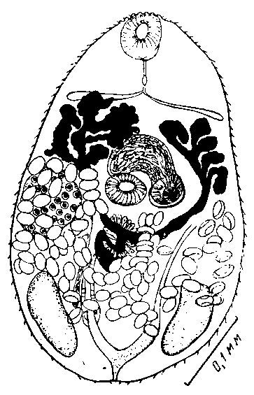 Семенники округлые, 0,059x0,054 мм, занимают латеральное положение позади брюшной присоски. Семенной пузырек заключен в сумку цирруса, которая имеет толстые мускулистые стенки, в них мускульные волокна расположены перпендикулярно продольной оси. Длина сумки цирруса 0,091 мм, ширина 0,048 мм. Семенной пузырек овальный, 0,064 X 0,038 мм, папилла 0,032 мм длины. Яичник лежит правее брюшной присоски и на ее уровне, размер яичника 0,059x0,048 мм. Желточники состоят из мелких фолликул и имеют характерное для рода расположение, они начинаются на уровне семенников, идут параллельно краям тела и не сходятся на заднем конце тела.