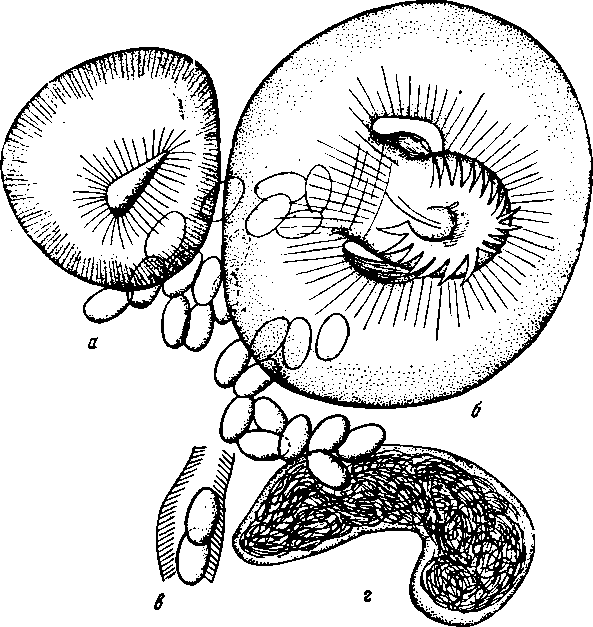 Топография органов: a — брюшная присоска; б — половая присоска; в — метратерм; г — семенной пузырек