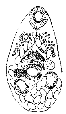 Желточный резервуар с хорошо заметными фолликулами, расположен дорзальнее передней части семяприемника. Лаурерова канала не обнаружено. Желточные фолликулы помещаются латеральнее пищеварительной системы, достигают уровня глотки, сливаются дорзально на уровне пищевода и не простираются за ветви кишечника. Матка занимает заднюю часть тела, справа идет вперед до брюшной присоски и образует поперечную петлю, простирающуюся до уровня глотки. Яйца относительно крупные, их не более 100 (в среднем 50), размер яиц 0,017—0,027 х0,010— 0,014 мм (0,022x0,012 мм). Экскреторный пузырь V-образный, экскреторная пора терминальна.
