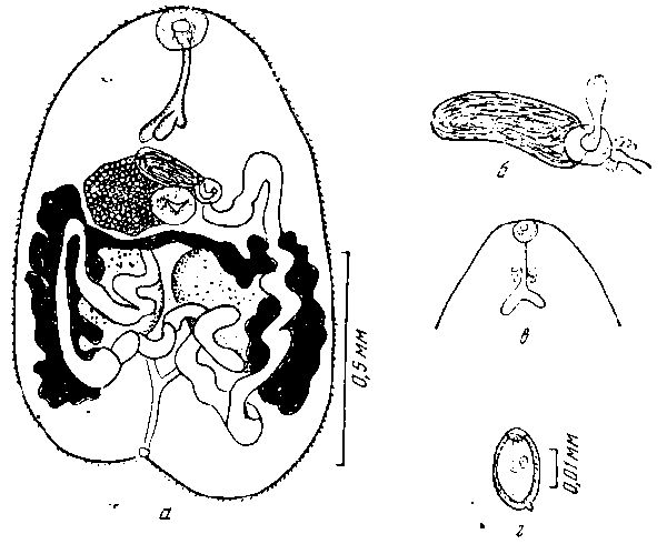 a — марита; б — концевой аппарат половой системы; в — передний конец с органами пищеварения; г — яйцо