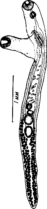 Кишечная бифуркация почти на уровне переднего края брюшной присоски, а кишечные стволы располагаются по краям тела и доходят до задней трети длины тела. Семенники расположены медианно, один позади другого в передней части задней половины длины тела; они имеют овальную форму, цельнокрайные и достигают 0,080—0,096 мм длины при ширине 0,12— 0,14 мм. Половая бурса небольшого размера, располагается впереди брюшной присоски.