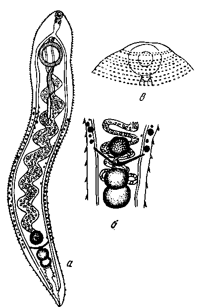 a — общий вид; б — деталь половой системы; в — расположение шипов на переднем конце