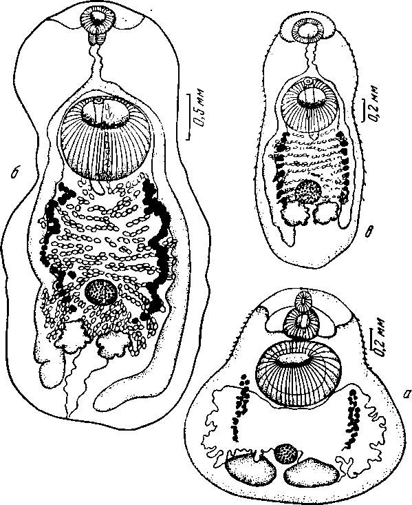а — Parorchis belopolskoi Skrjabin, 1965; б — P. parricollis Belopolskaja, 1963; в — P. asiaticus magna Belopolskaja, 1963