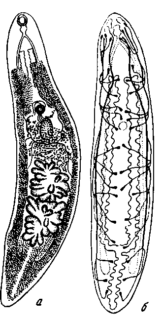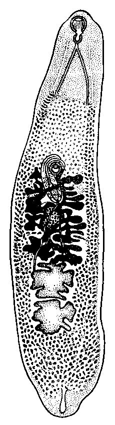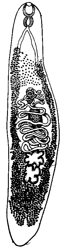 Префаринкс очень короткий, пищевод довольно длинный. Кишечные стволы простираются до заднего конца тела. Брюшная присоска меньше ротовой, она достигает лишь 0,19 мм в диаметре. Семенники расположены один позади другого в задней поло вине тела; их края резко выемчаты, образуют 6—8 лопастей. Длинная половая бурса, достигающая 0,52 мм длины и 0,07 мм ширины, открывается несколько слева, впереди брюшной присоски, проходя над ее дорзальной поверхностью.