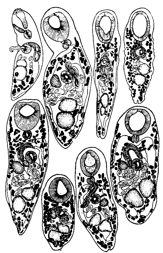 Neoglyphe megastomum (Baer, 1943) разных возрастов в разных положениях (по Бэру, 1943)