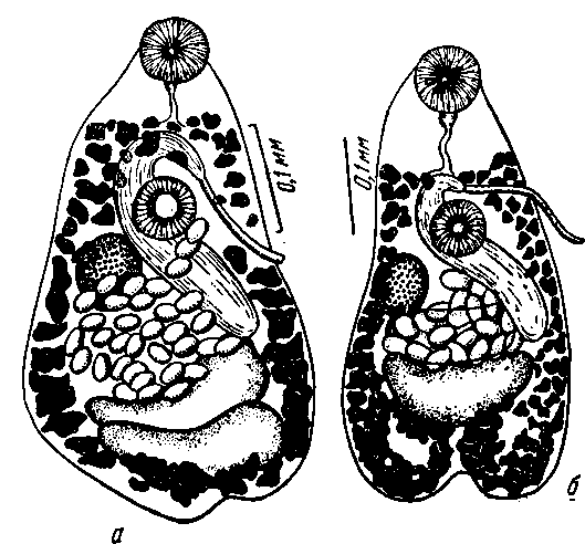 Половое отверстие располагается между брюшной присоской и бифуркацией кишечника. Позади брюшной присоски и справа расположен почти круглый яичник, достигающий 0,0526—0,073 мм в диаметре. Позади яичника располагаются один за другим оба семенника, занимающие почти всю ширину тела. Размеры переднего семенника 0,062—0,075 X 0,155—0,186 мм. Размеры заднего семенника 0,062—0,105 X 0,155—0,205 мм. Семенники не доходят до самого заднего конца тела. Матка наполнена яйцами. Размеры яиц 0,0275—0,0336 X 0,020—0,025 мм. Матка занимает середину тела, расположена между брюшной присоской и семенниками. Иногда она налегает на передний семенник.