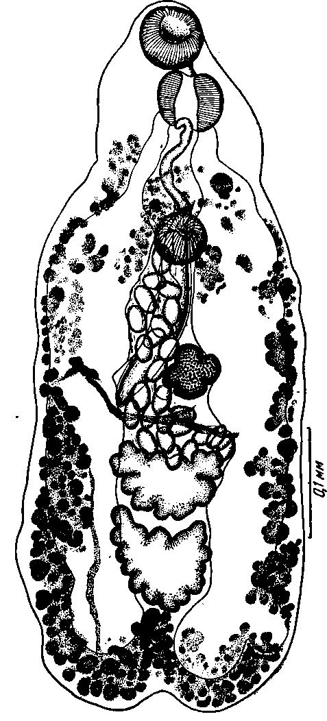 Семенники очень крупные, вытянутые в поперечном направлении, плотно прилегают друг к другу или налегают один на другой. Размер переднего семенника 0,083—0,098 X 0,216—0,240 мм. Размер заднего семенника 0,066—0,098 X 0,199—0,240 мм. Желточники, состоящие из крупных фолликулов, простираются от заднего края ротовой присоски до конца тела, группируясь в латеральных краях. Желточники позади семенников сливаются. Небольшая матка расположена в пространстве между задним концом половой бурсы, яичником и передним семенником. Яйца достигают 0,036—0,046 X 0,016—0,025 мм.