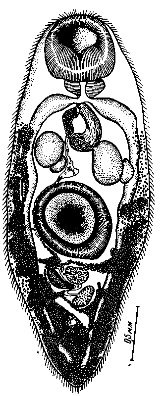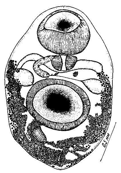 Половая бурса U-образцая, содержит свернутый семенной пузырек. Половое отверстие расположено субмедианно на уровне переднего края фаринкса. Яичник овальный, 0,17 — 0,22 X 0,11—0,17 мм, расположен позади брюшной присоски. Семеприемник и лауреров канал имеются. Желточники из мелких округлых фолликулов, лежащих почти кнаружи от кишечных ветвей, впереди они почти достигают уровня фаринкса. Петли матки расположены главным образом позади брюшной присоски. Латеральные петли ее достигают переднего края семенников. Яйца тонкоскорлуповые, 0,03 — 0,031 X 0,012 — 0,013 мм.
