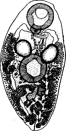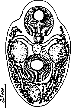 Описание вида (по Травассосу, 1928). Тело достигает 2,0 X 1,3 мм. Ротовая присоска мощная, 0,67 мм в диаметре, расположена субтерминально. Брюшная — 0,53 мм в диаметре, расположена постэква-ториально. Фаринкс 0,22 мм в диаметре, расположен непосредственна вблизи ротовой присоски. Пищевод отсутствует. Ветви кишечника длинные, сначала они идут поперечно, а затем вдоль боковых краев тела достигают его заднего конца. Семенники округлые, 0,41 X 0,45 — 0,50 мм, расположены экваториально, заходя в зону брюшной присоски.