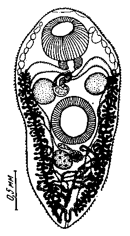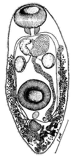 Семенники расположены внутри межкишечного пространства, яичник посредине между брюшной присоской и задним краем тела - Posthovitellum longicirratus (Jaiswal et Vasudev, 1960).