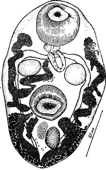 Она содержит свернутый по спирали семенной пузырек и открывается наружу медианно сразу позади фаринкса. Яичник овально-вытянутый, расположен посредине между брюшной присоской и задним краем тела и достигает 0,12 — 0,19 X 0,23 — 0,32 мм. Тельце Мелиса расположено латерально от яичника сразу позади брюшной присоски. Желточники впереди не переходят уровень середины брюшной присоски; сзади — оканчиваются в субкаудальной области. Матка сильно извитая. Ее латеральные петли достигают впереди уровня середины ротовой присоски. Яйца тонкоскорлуповые, 0,025 — 0,028 X 0,009 — 0,012 мм.