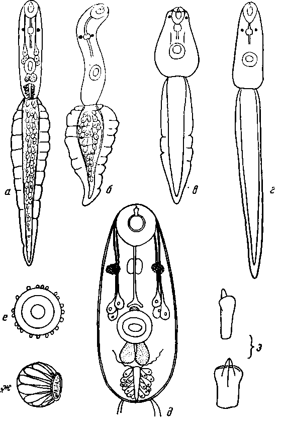 a - г - церкарии в состоянии различного сокращения; д — строение церкария; е, ж— железа брюшной присоски; г — стилеты