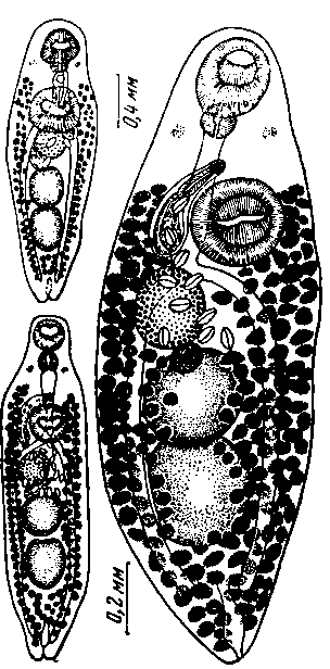 Отношение размеров брюшной к ротовой присоске равно 1,5—1,6 : 1. Расположена брюшная присоска несколько отступя к заднему концу тела от бифуркации кишечника. Половая бурса с семенным пузырьком помещается сбоку от брюшной присоски, огибая ее от заднего края брюшной прй-соски до начала бифуркации кишечника. Половое отверстие открывается под бифуркацией кишечника почти по средней линии тела.