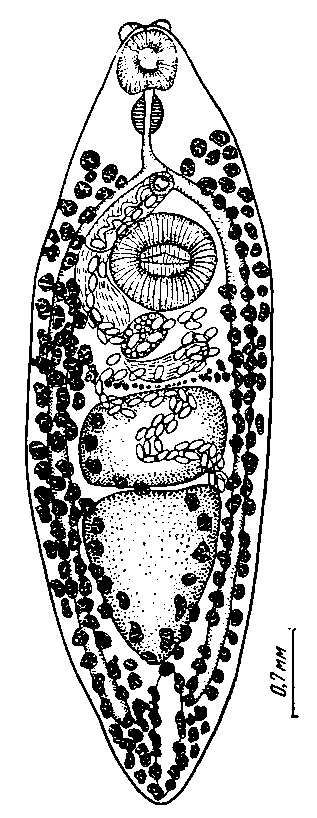 Передний семенник неправильной, четырехугольной формы, 0,7—0,9 X 0,1—0,11 мм, с выпуклыми боковыми краями, прилегает к заднему семеннику, 1,2 X 0,8— 1,1 мм, форма которого напоминает треугольник с суженным и вытянутым задним концом. Многочисленные желточные фолликулы расположены по обеим сторонам тела от уровня фаринкса, покрывают кишечные стволы и сливаются на заднем конце тела, заполняя участок тела за задним семенником. Два экскреторных ствола тянутся по бокам тела от передней присоски и впадают в экскреторный пузырь на заднем конце тела.