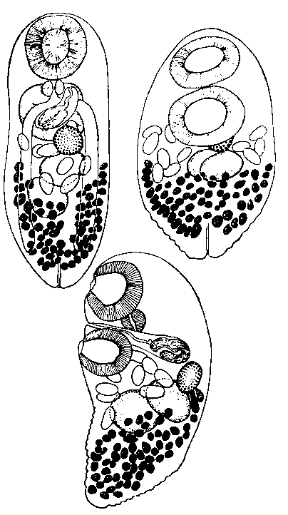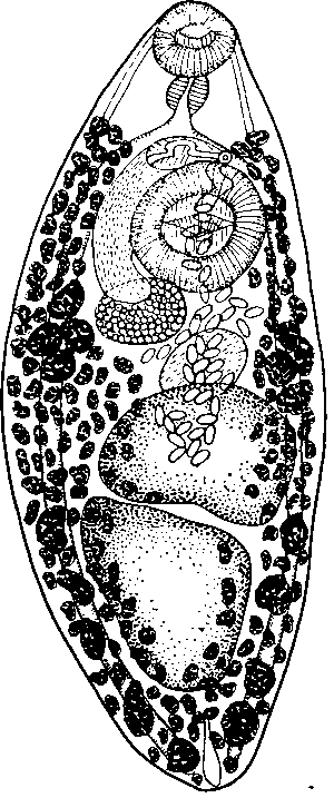 Матка содержит около 200 яиц, размеры их 0,078—0,084 X 0,06 мм; петли матки слегка заходят за передний край заднего семенника. Многочисленные желточные фолликулы расположены в виде двух широких полос по обеим сторонам тела, начинаясь выше бифуркации кишечника и сливаясь на заднем конце тела за задним семенником. У некоторых особей наряду с обычными встречаются крупные фолликулы, которые располагаются в группы по четыре, на уровне яичника, а одиночные расположены четкообразно по бокам тела от заднего края переднего семенника до заднего конца тела.