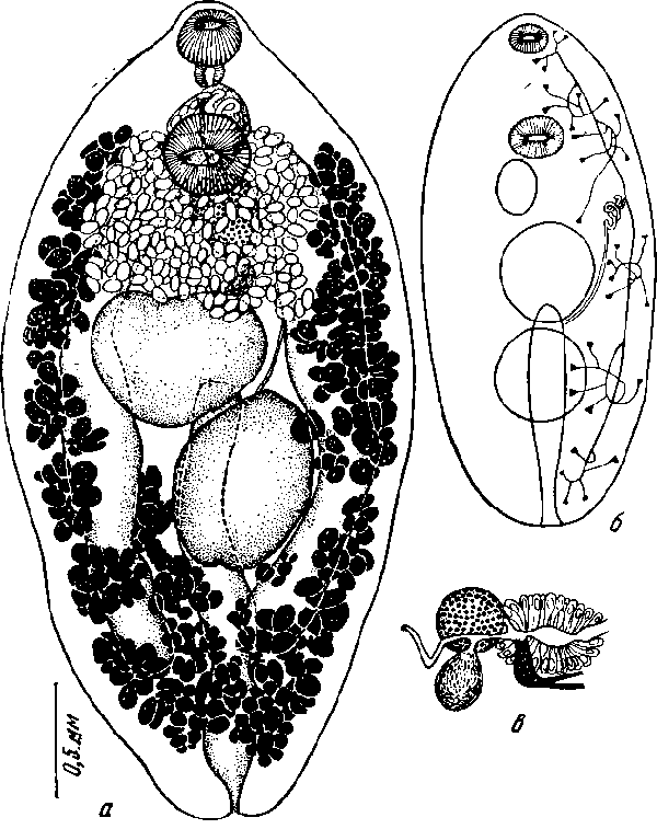 a — марита; б — экскреторная система; в — комплекс женских половых органов