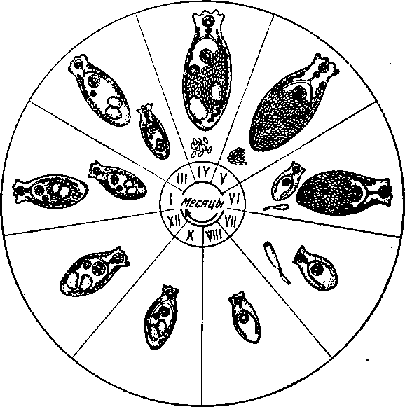 Церкарий. Размеры 0,14—0,35x0,06—0,04x0,30 мм. Церкарии очень подвижны и форма их подвержена изменениям. В растянутом состоянии (0,30—0,35x0,05 мм) церкарий принимает удлиненную форму, а в сокращенном (0,14x0,12 мм) он становится значительно короче и шире и принимает форму груши. Плавательные движения церкария быстрые и напоминают такие у ксифидиоцеркариев; тело изгибается на брюшную