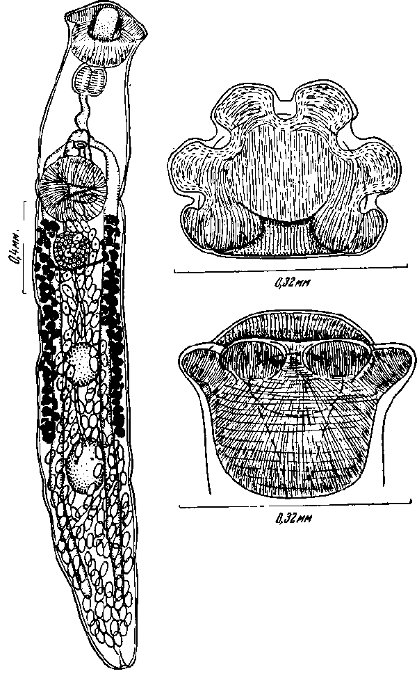 Яичник округлый, его диаметр 0,16 мм, он располагается в средней плоскости тела на небольшом расстоянии от заднего края брюшной присоски. От дорзальной поверхности середины правого края яичника отходит короткий и толстый яйцевод. Этот проток впадает в оотип, дорзально от которого располагаются крупные клетки тельца Мелиса. Семяприемник связан с оотипом узким канальцем. Собственно семяприемник крупный, мешковиднй, его проксимальная часть доходит почти до продольной средней линии яичника и располагается дорзально от последнего.