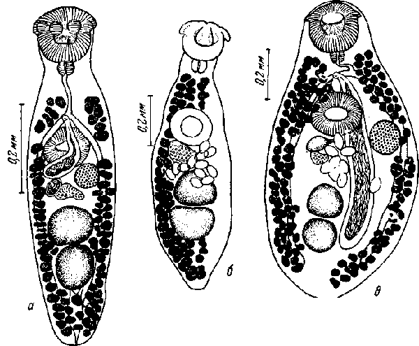 а — марита с дорзальной стороны; б — марита с суженной шейкой; в — марита ненормально длинной половой бурсой