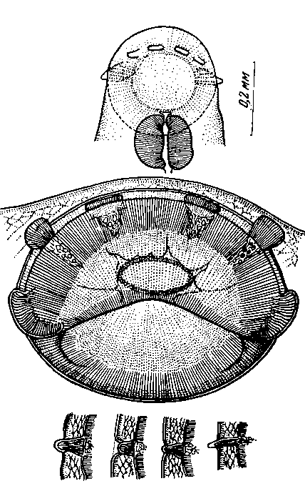 Гистологическое строение сосочков и кутикулы подробно описал Николь (1909). Однако следует обратить внимание на то, что латеро-вентральные сосочки имеют иную форму, чем остальные, которые все одинаковы между собой. С вентральной стороны эти сосочки имеют форму семени дыни, достигают 0,03—0,05 мм ширины и 0,100—0,144 мм длины, считая от края отверстия присоски. Их заостренные концы выступают только слегка за край присоски, а иногда только заходят за латеральные края тела. Лучше всего рассматривать их с передней стороны тела.