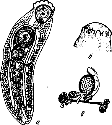 a — марита; б — сосочки на головном конце; в — комплекс женских органов