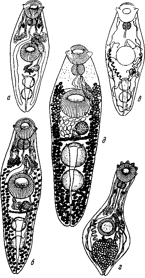 a — в — метацеркарий; г — незрелая форма из лосося; д — взрослая форма