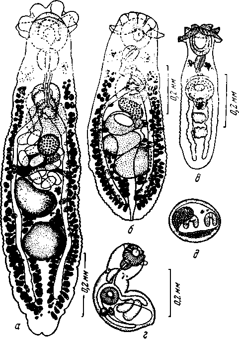 a — зрелая марита с дорзальной стороны; б — молодая марита с вентральной стороны; в — незрелая марита; е—метацеркарии из нимфы поденки; д — инцистированный метацеркарий из нимфы поденки.
