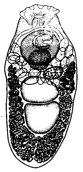 Приблизительно шаровидный яичник лежит несколько слева от медианной линии. Непосредственно впереди него помещается тоже шаровидный семяприемник одинакового размера с яичником. Петли матки простираются между кишечными стволами от семенников до полового отверстия.