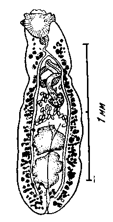 Гладкие, узкие кишечные стволы не доходят до заднего конца тела. Брюшная присоска несколько меньше ротовой, достигает 0,15 мм в диаметре. Два крупных семенника лежат в задней половине тела, их края несколько лопастные, причем форма семенников очень изменчива. Семяпроводы ведут в очень крупную S-образно изогнутую половую бурсу, которая значительно выдается за задний край брюшной присоски и открывается в половое отверстие впереди брюшной присоски.