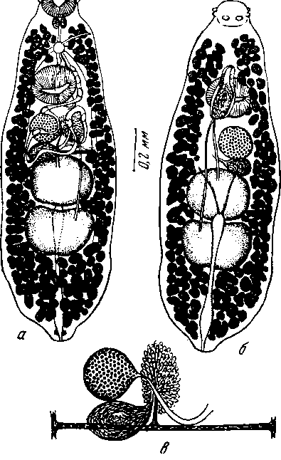 а, б — мариты вентрально и дорзально; в — комплекс женских половых органов