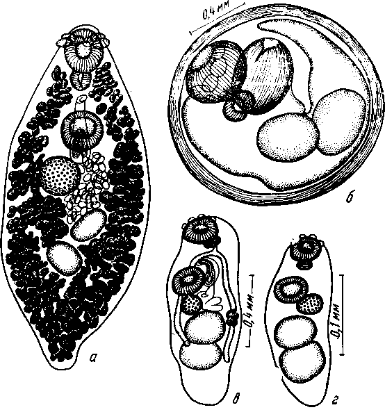 а - марита; б — метацеркарий в цисте; в — метацеркарий в мускулах бокоплава; г — молодая трематода из кишечника форели