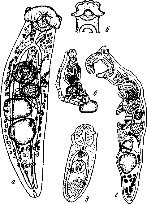 a — марита; б — головной конец; в — комплекс половых органов; г — сагиттальный срез мариты; д — молодой экземпляр
