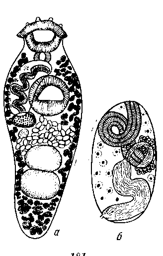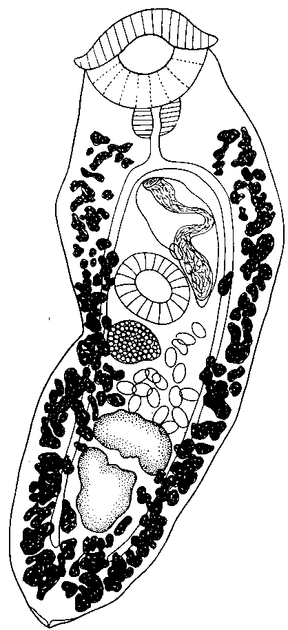 Половое отверстие находится на небольшом бугорке, сейчас же позади разветвления кишечника и несколько впереди брюшной присоски.