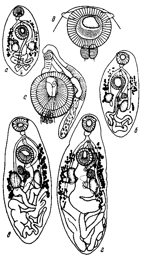 а - г - мариты разных возрастов; д — ротовая присоска; е — брюшная присоска и концевые половые протоки